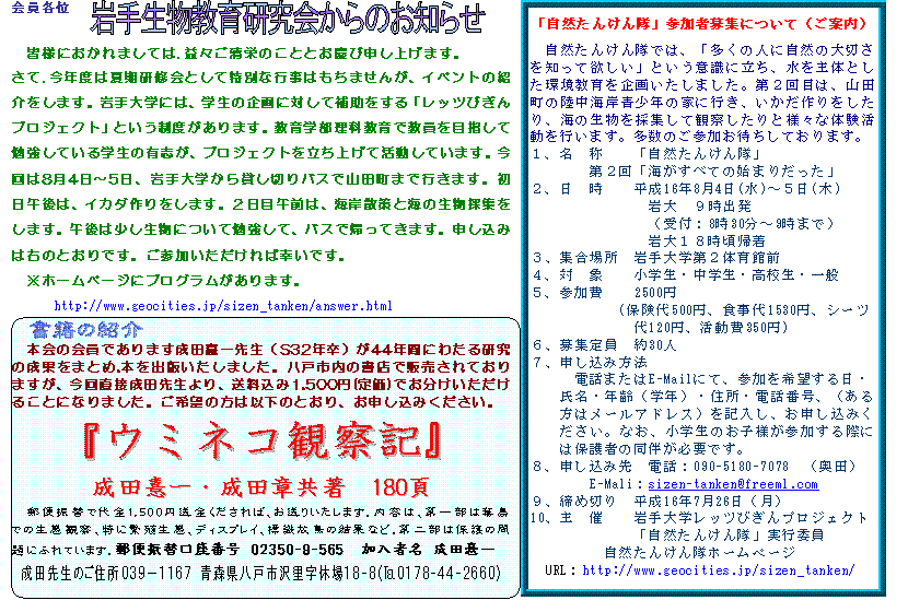 ●岩手生物教育研究会では、平成16年の研修会は特に設定しませんが、