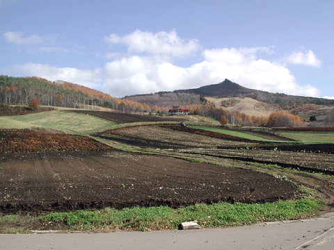 烏帽子岳と畑です。トラクターで山の斜面を耕しています。