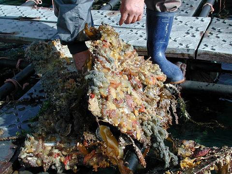 山田町水産種苗センター研究用イカダから吊されているユウレイボヤ採集用の