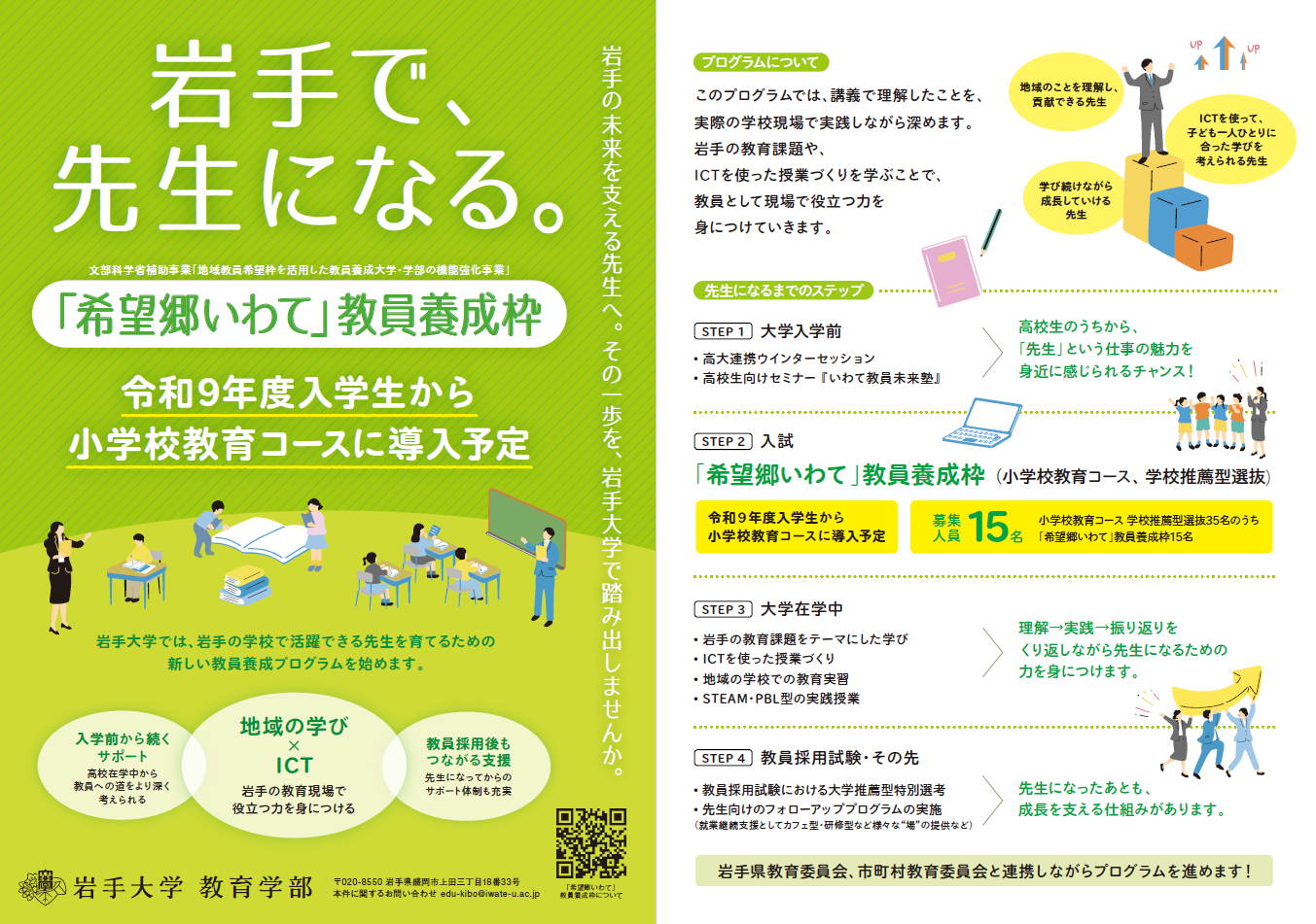 令和9年度入学生から、学校教育教員養成課程の小学校教育コースにおいて、「希望郷いわて」教員養成枠を導入します。