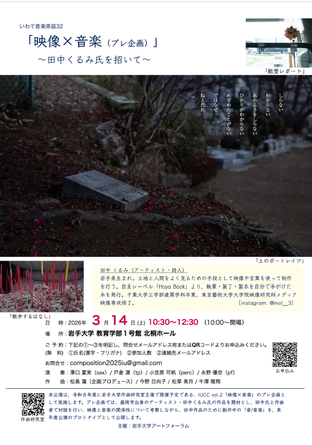 岩手大学アートフォーラムでは、令和8年度に岩手大学作曲研究室主催で開催予定である「映像×音楽」のプレ企画として、いわて音楽茶話vol.32「映像×音楽(プレ企画)」を開催いたします。