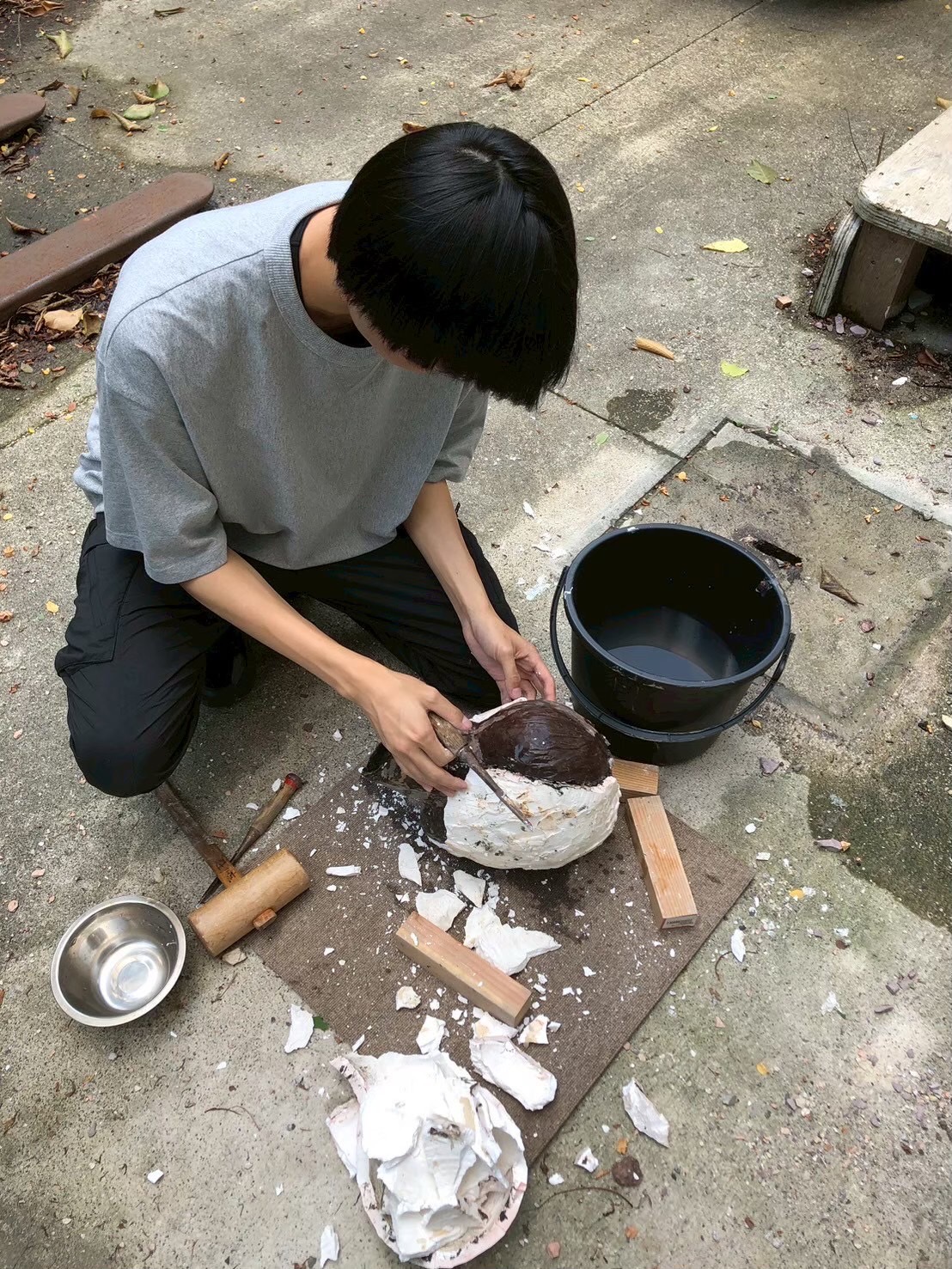 私にとっての「乾漆」による彫刻制作のおもしろさは、「私自身の思い通りに制作が進まない」ところにあります。例えば漆の硬化には、適当な気温と湿度が必要になります。そのため季節や天候によって、漆が固まるまでに掛かる日数は変化します。その変化に応じていかなければ、制作を続けることができません。こうした素材や自然がつくる「時間」に自分自身を重ねてゆく過程で、新しいイメージが湧いてきます。思い通りにはいかないことを大切にしながら、人間と自然や土地との関係性をテーマとした作品制作を行っています。