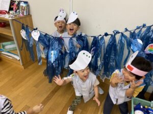 7月。立派に生長した竹を切ってもらい、年少組、年中組のお部屋まで運びます。願いを込めた七夕かざり。